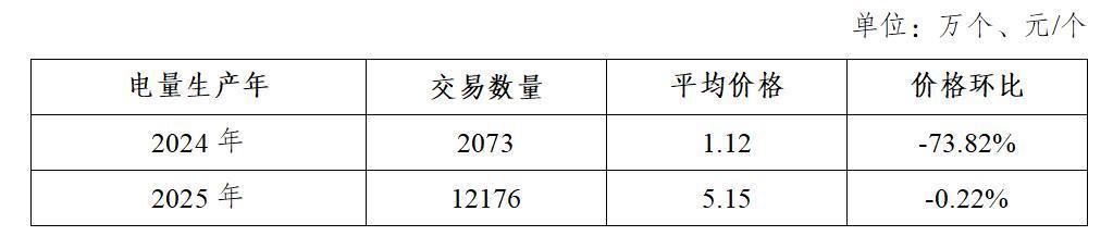 2025年12月,电量生产年为2024年的绿证交易平均价格1.12元/个,电量生产年为2025年的绿证交易平均价格5.15元/个。