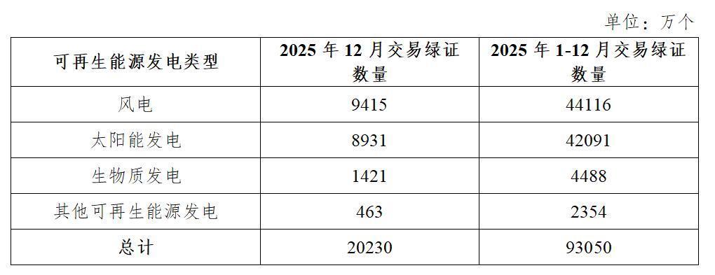 2025年12月,全国交易绿证2.02亿个,其中绿色电力交易绿证2275万个。2025年1-12月,全国共计交易绿证9.30亿个,其中绿色电力交易绿证2.50亿个。
