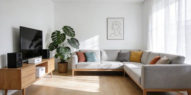 原户型无独立玄关,入户即客厅,显得杂乱。设计师利用入户左侧墙面,定制了一组嵌入式鞋柜,柜体深度24cm,与墙面齐平不占动线,完美契合小户型需求。原木色纹理温润,中和了浅色系墙面的清冷感。柜体下方预留15cm空层,可放置常穿鞋子和扫地机器人;中间留空做换鞋台,搭配壁挂穿衣镜,既方便整理仪容,又能拉伸视觉纵深感。整个玄关虽仅1㎡,却实现了“鞋柜+换鞋区+装饰”三重功能,细节拉满。