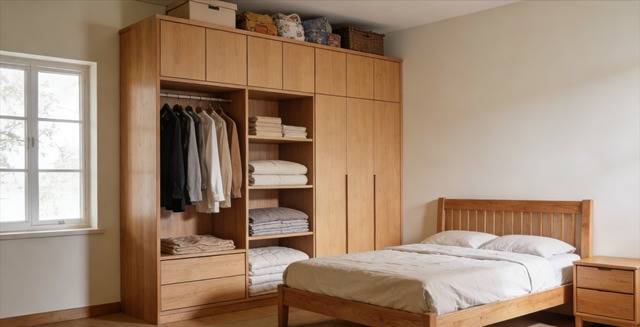 主卧朝南,空间相对充裕,设计师沿墙面定制了整面橡胶木到顶衣柜,柜体分为挂衣区、叠放区和被褥区,顶部可收纳闲置物品,将储物空间最大化。衣柜门板采用简约平板设计,无多余装饰,与床架、床头柜形成风格统一,木质纹理相互呼应,营造出温馨的睡眠氛围。