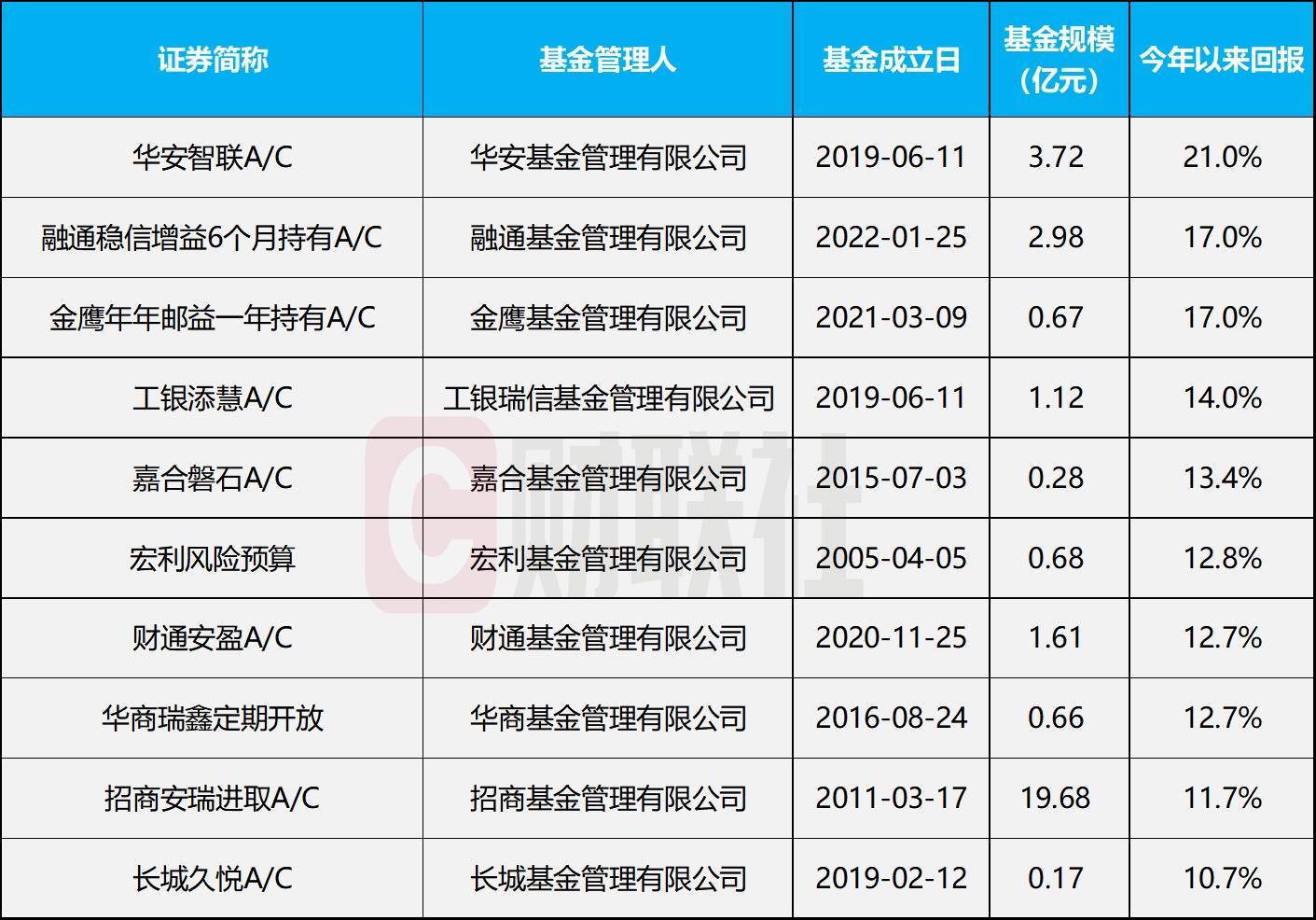 2026年以来,A股市场结构性行情为“固收+”基金提供了良好的增强收益环境,部分产品取得了不俗的业绩表现。截至4月21日,今年以来,固收+基金整体表现亮眼,93%的基金实现了正收益。今年以来收益排名前十的基金表现如下图所示: