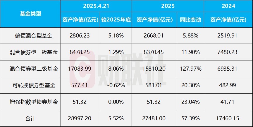 与此同时,偏债混合型基金也保持了稳健的增长态势,2024年末规模0.25万亿,2025年增长5.8%至0.27万亿,截至4月21日,其规模突破0.28万亿,较2024年末增长5.18%。几类固收+基金近年来规模变化如下图所示: