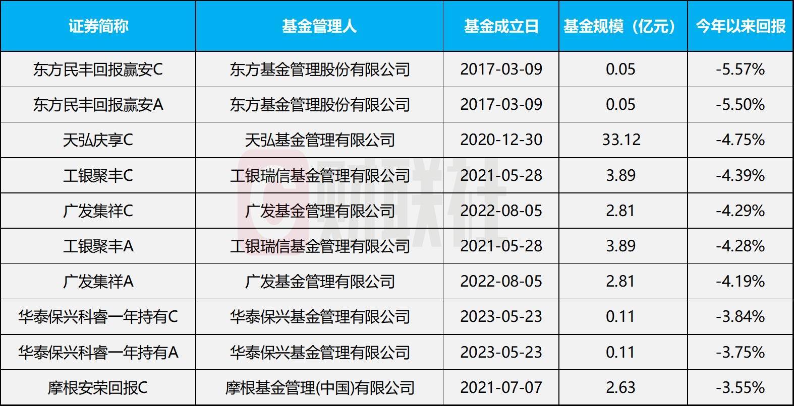 然而,在固收+基金整体收益表现较好的基础上,部分基金却有所亏损。Wind数据显示,截至4月22日,东方基金管理的东方民丰回报赢安今年以来亏损5.5%。一季报显示,今年1季度,该基金主要投向制造业,占比21.94%,信息传输、软件和信息技术服务业投资占比6.82%。在投资策略中,基金经理表示,该基金在权益和转债的仓位相对稳定,主要考虑风险事件发生过于突然和迅猛,后续仍会主要选择科技成长赛道中景气度较高以及年内业绩较好的方向进行配置。今年以来收益排名后10名的固收+基金如下图所示: