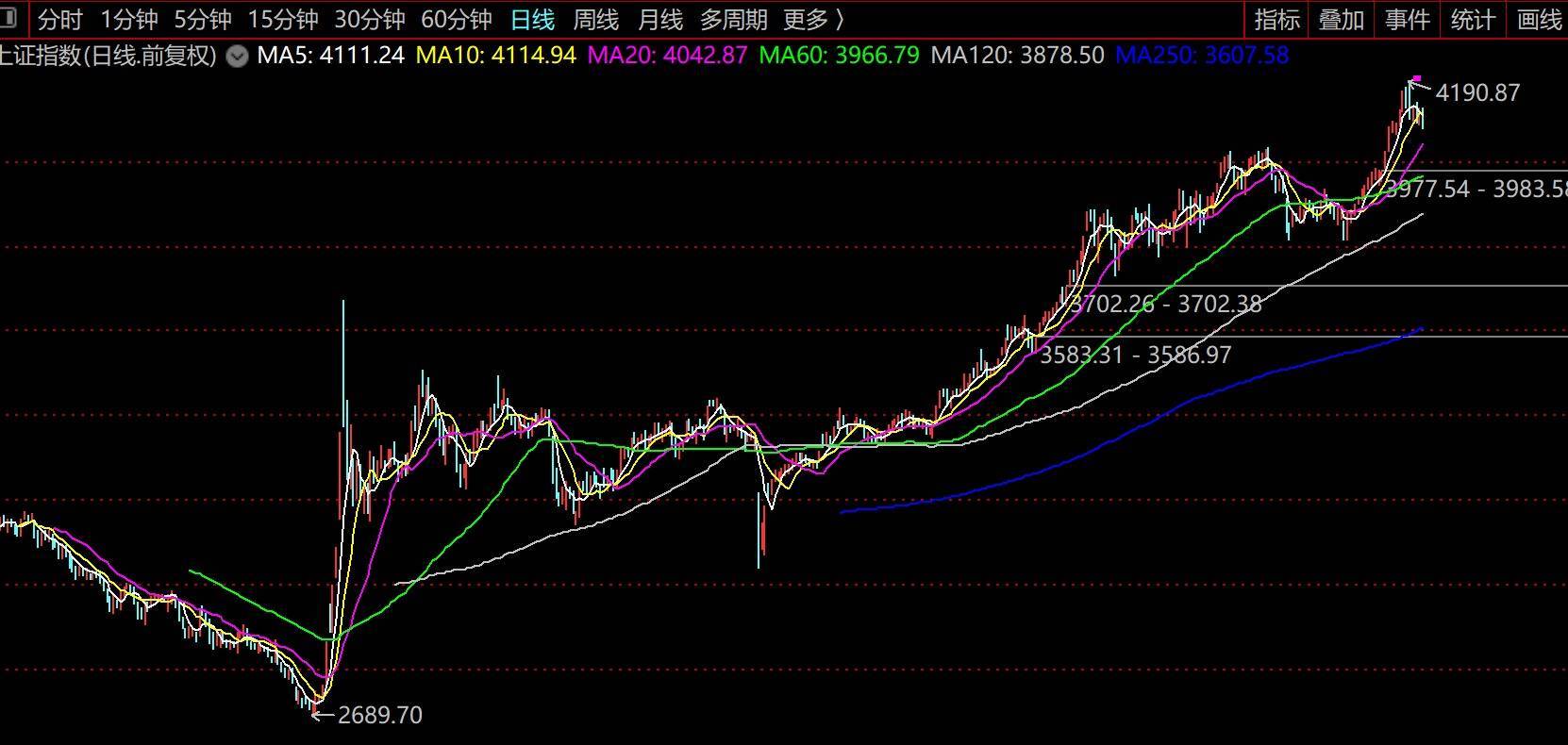 数据显示,2025年12月17日以来,A股持续上涨,上证指数一度出现17连阳,最高探至4190点,创下10年新高,市场成交额更是创下历史之最,最高接近4万亿。