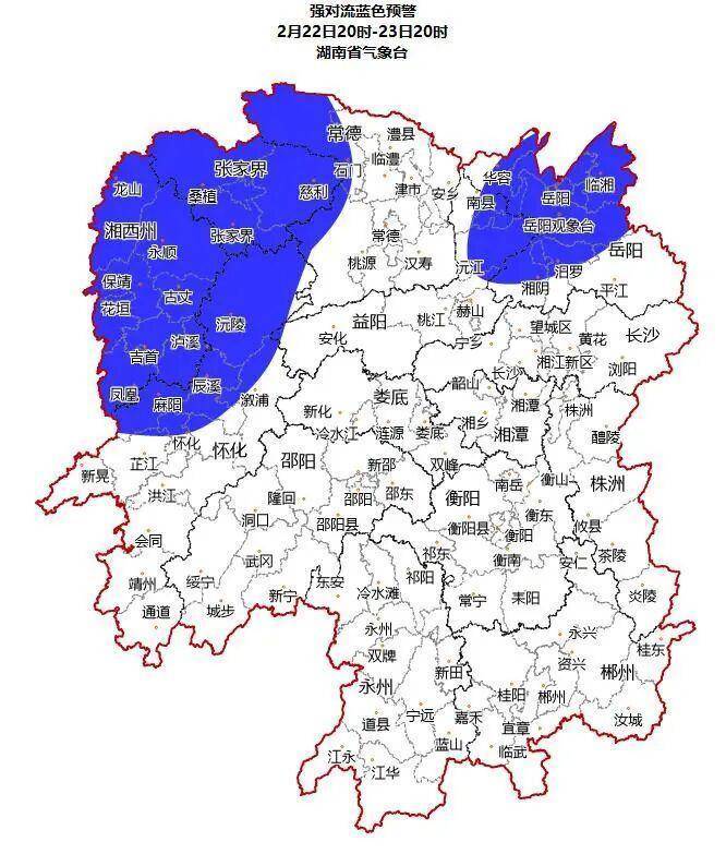 从全省来看,湖南省气象台预计,22日晚到23日省内有一次中到大雨、局地暴雨过程,并伴有雷暴大风等强对流天气。省气象台已于今日16时发布强对流蓝色预警,预计22日20时到23日20时,湘西、湘北部分地区将出现8级以上雷暴大风,伴有短时强降水或局地小冰雹,蓝色预警区域包括湘西州、张家界、常德北部、益阳北部、岳阳北部、怀化北部。