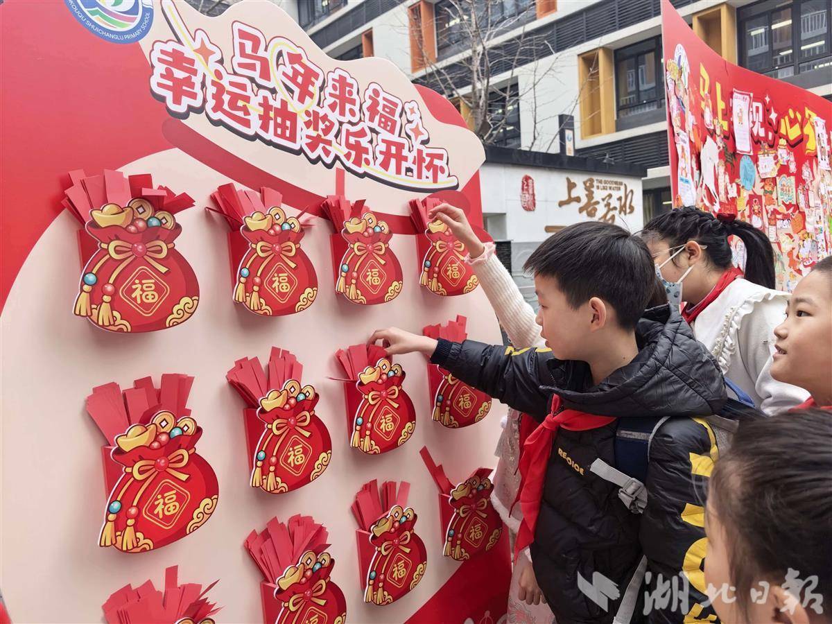 在硚口区水厂路小学,马年特色活动同样火热。走上红毯敲响红鼓,立下新学期志向;“马年来福”幸运抽奖惊喜不断,“免作业一次”“与老师拥抱”“获赠课外书”……一张张笑脸比春花更灿烂。