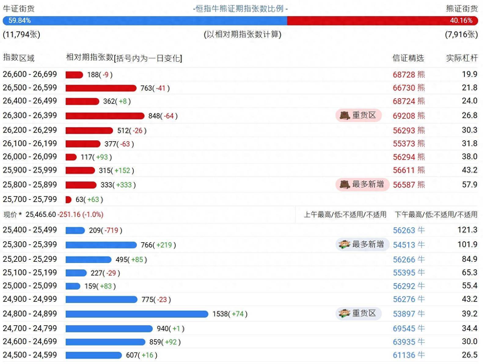 中信证券牛熊证街货分布图中的数据显示,熊证街货重货区在26300-26399区间,该区间最新熊证数量为848张,较上一交易日减少64张;熊证街货最多新增在25800-25899区间,该区间最新熊证数量为333张,较上一交易日增加333张。