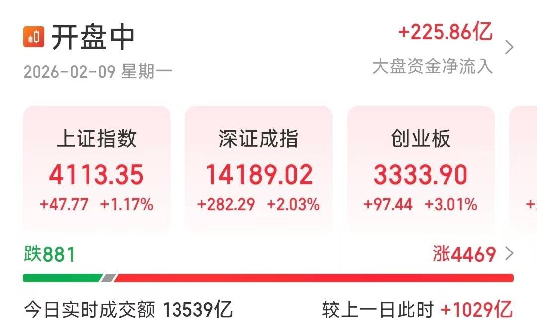 【大河财立方消息】2月9日,A股三大指数持续走强,截至11时03分发稿,沪指涨1.17%,深证成指涨2.03%,创业板指涨3.01%。全市场实时成交额1.35万亿元,较上一个交易日同时段放量1029亿元。盘面上,CPO、光伏、影视等板块指数涨幅居前,沪深京三市超4400股上涨。