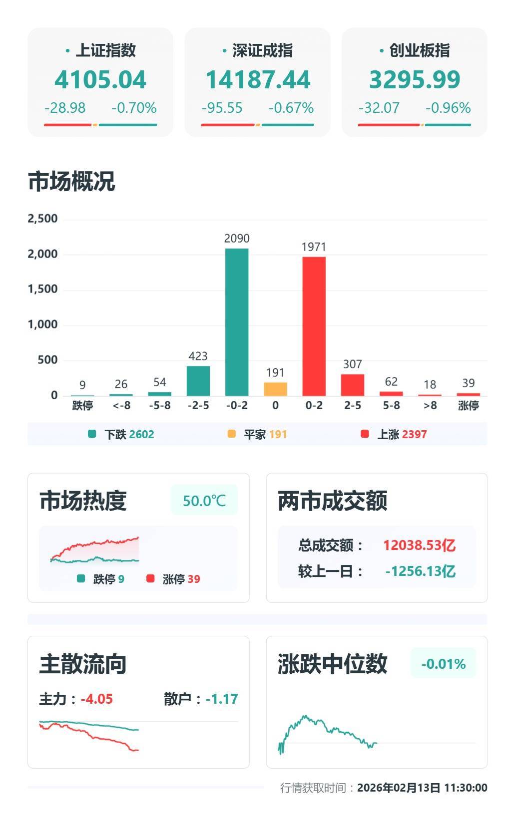 早盘A股三大指数低开低走,截至午间收盘,沪指跌0.7%,报4105.04点,深成指跌0.67%股票配资股票配资,报14187.44点,创业板指跌0.96%,报3295.99点,科创50指数跌0.09%,报1479.67点。量能大幅萎缩,沪深两市合计成交额12038.58亿元,较上个交易日缩量1256亿,全市场超2600股下跌。