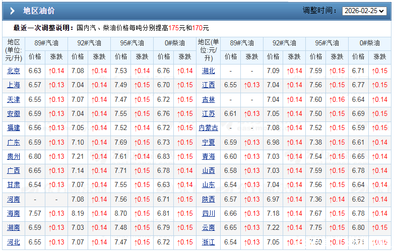 截至2026年2月26日,今天,新周期完成第2个工作日,参考昨日WTI原油报价在65.42美元/桶(-0.21美元),布伦特原油报价在70.85美元/桶(+0.08美元),重新评估后,新周期前2个交易日,原油均价在68.17美元/桶,汇总三地原油变化率2.27%,汽柴油预估上涨110元/吨,折合本次调价上涨预期在0.08~0.1元/升左右。