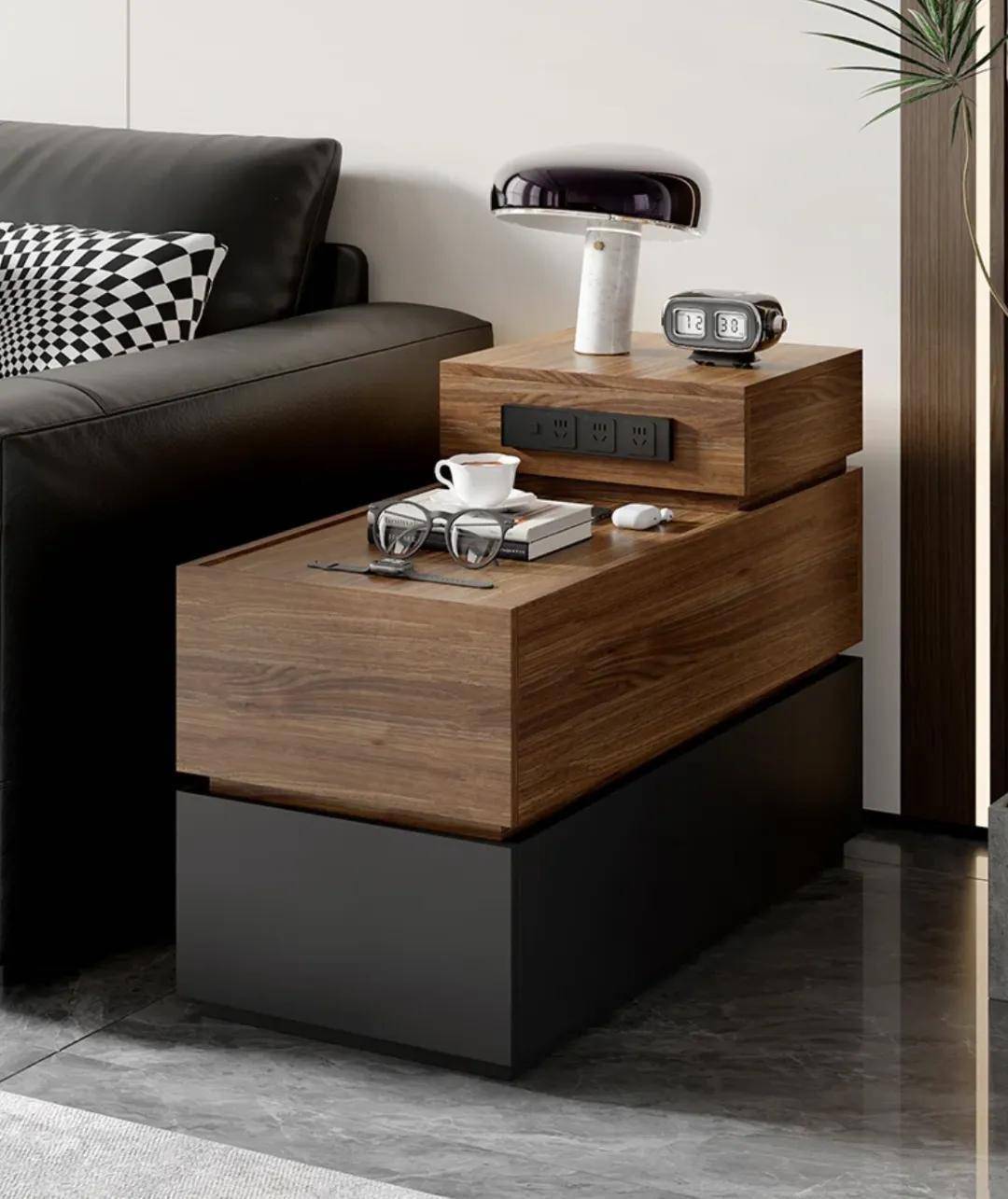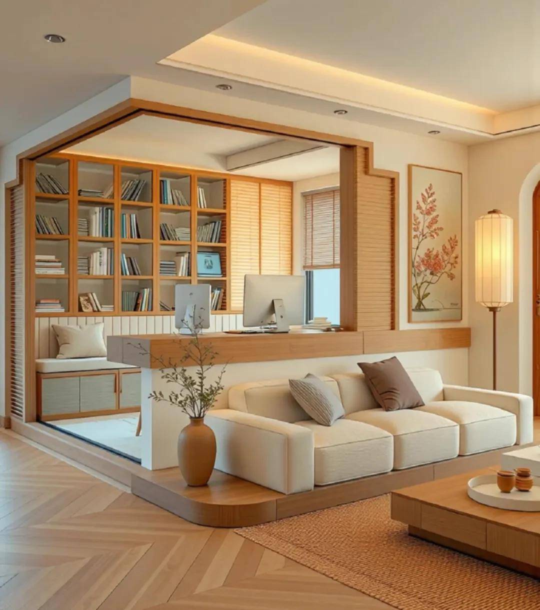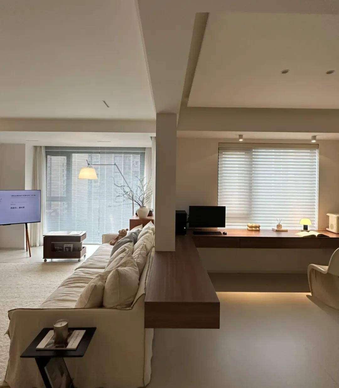 关于收纳,其实拆墙后更要讲究,我做了一个“隐区收纳”:茶几下方放抽屉篮、沙发边上放窄边柜,这些小东西超级能装。
