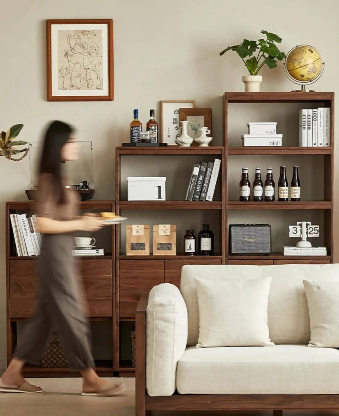 讲讲柜子,我最服我自己的一点,就是没去做厚柜子压空间,而是用开放书架+半柜组合,颜色选了焦糖色木纹,暖但不沉。