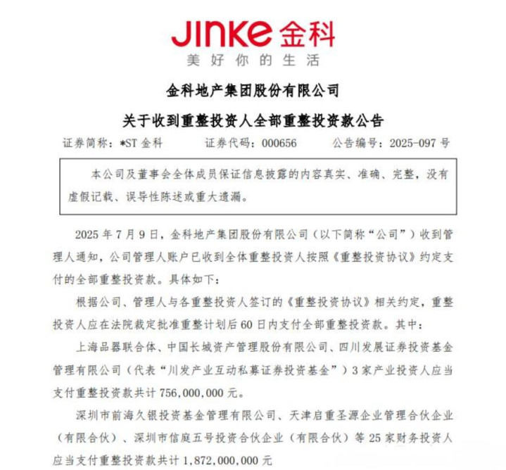 而与之形成鲜明对比的是金科,2025年7月,金科公告称26.28亿元重整投资款已全额到账,这笔钱让身负1470亿债务、涉及8400家债权人的金科,从破产边缘拉了回来。